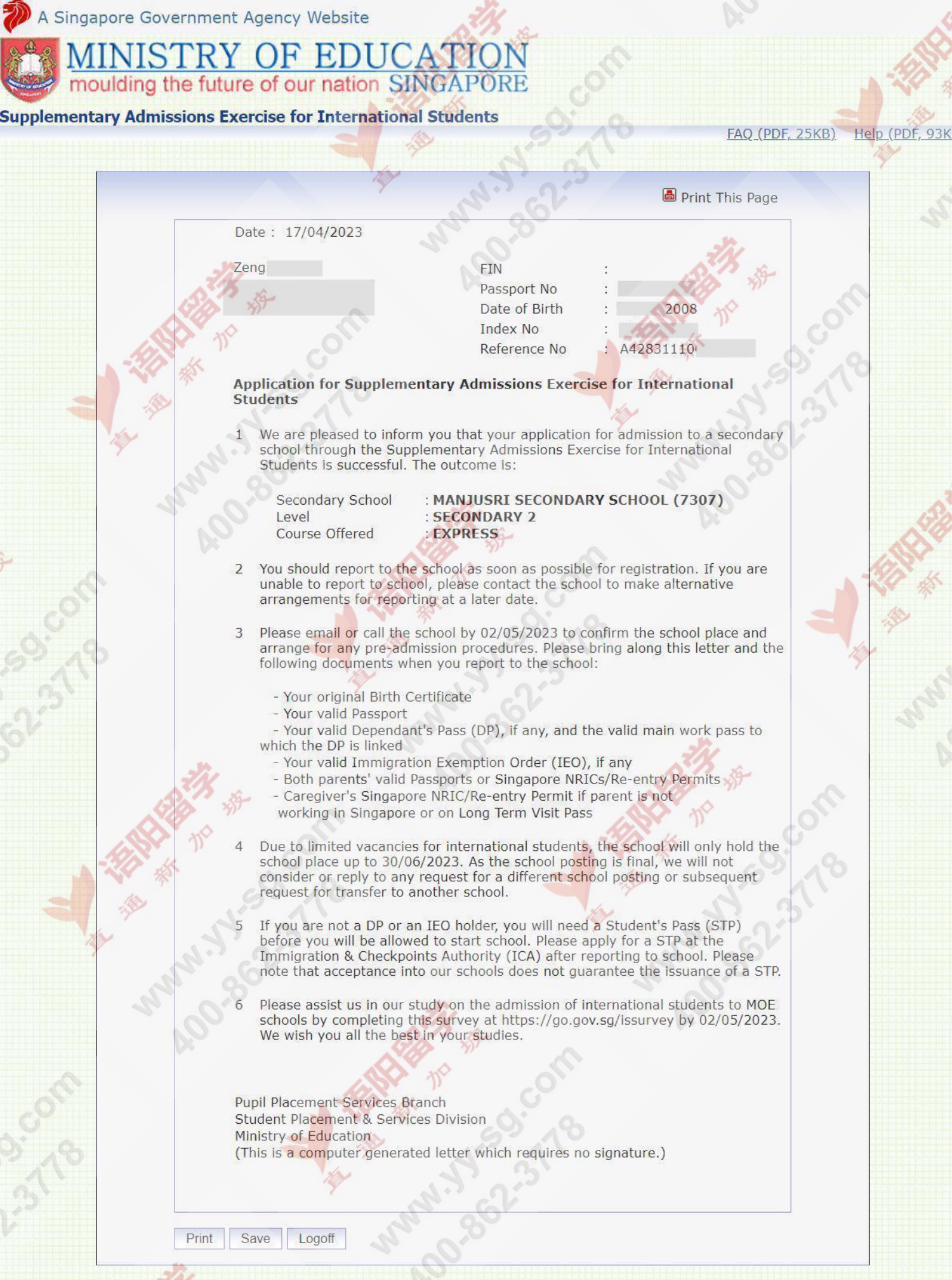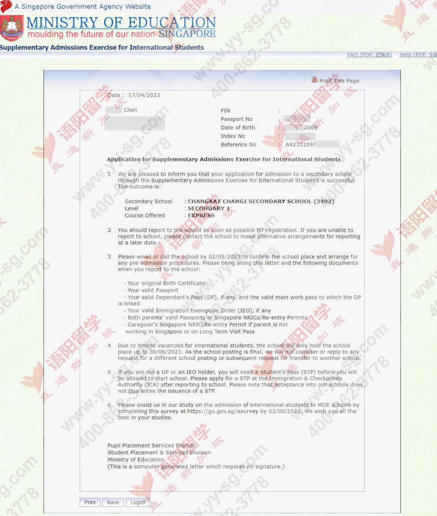 2023年04月17日,新加坡教育部网站公布了2023年2月S-AEIS中小学考试录取结果,4名语阳学子成功考取新加坡政府学校。