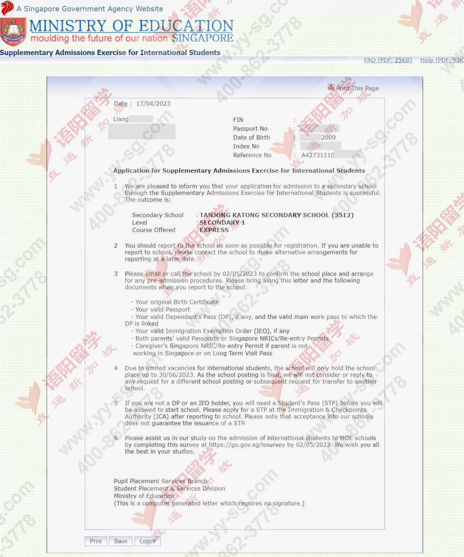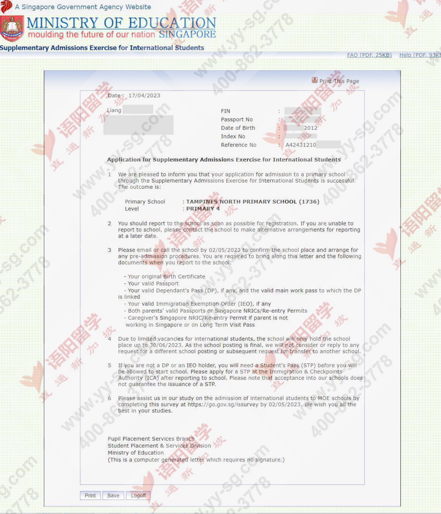 4.LIANG同学被TAMPINES NORTH小学录取